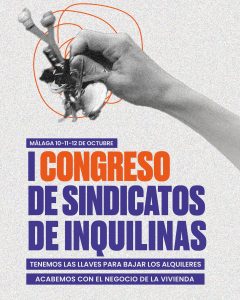 Los días 10, 11 y 12 de octubre, nos daremos cita en Málaga para celebrar el primer Congreso estatal de Sindicatos de Inquilinas. A través de este Congreso, aprobaremos unos documentos compartidos bajo los cuales constituiremos una organización conjunta que coordine la acción de los distintos sindicatos en todo el Estado.